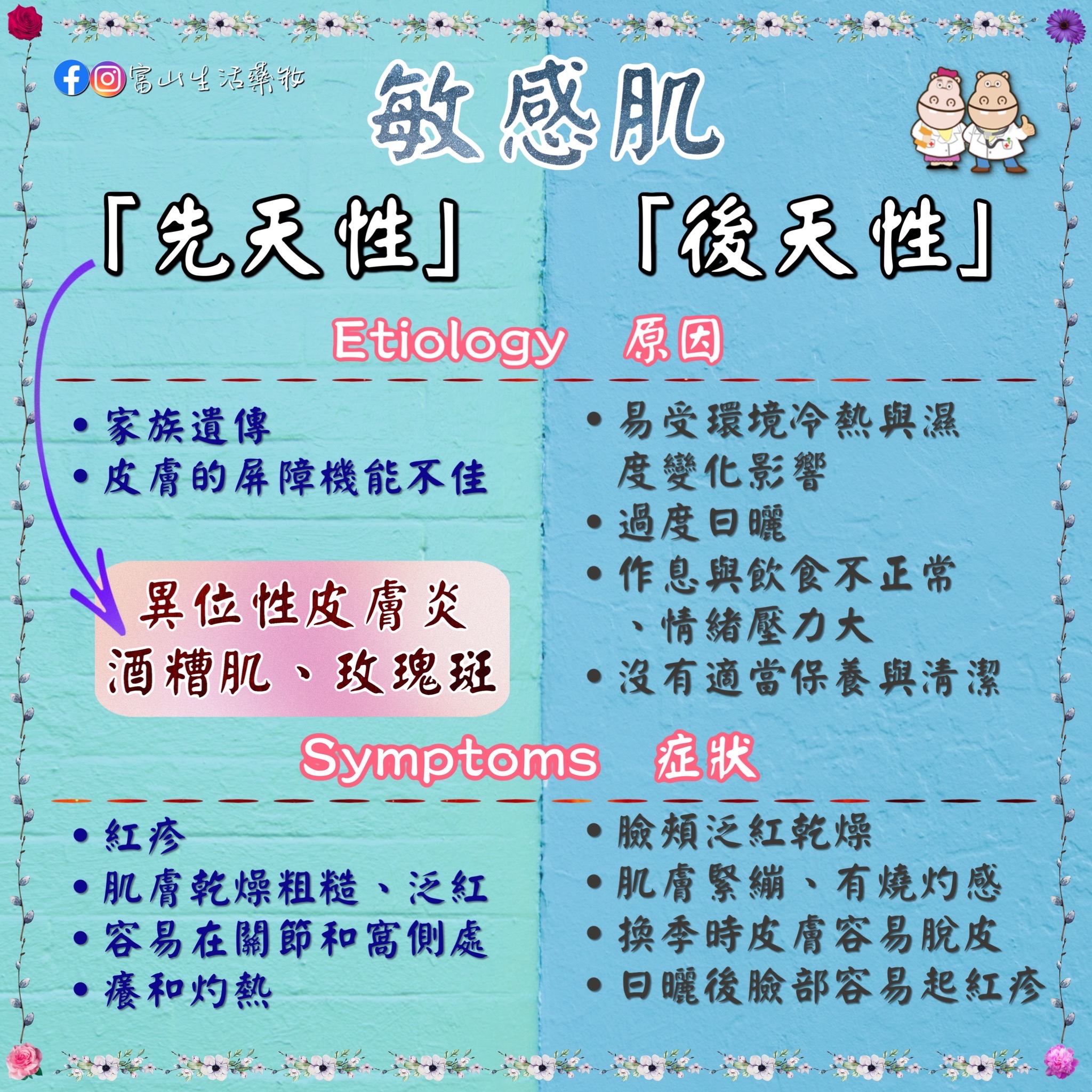 先天性:主要是遺傳,皮膚屏障機能不佳。會有紅疹、粗糙泛紅、癢、灼熱、易發生在關節和窩側處!就是大家最常聽到的『異位性皮膚炎』、『酒糟肌、玫瑰斑』!