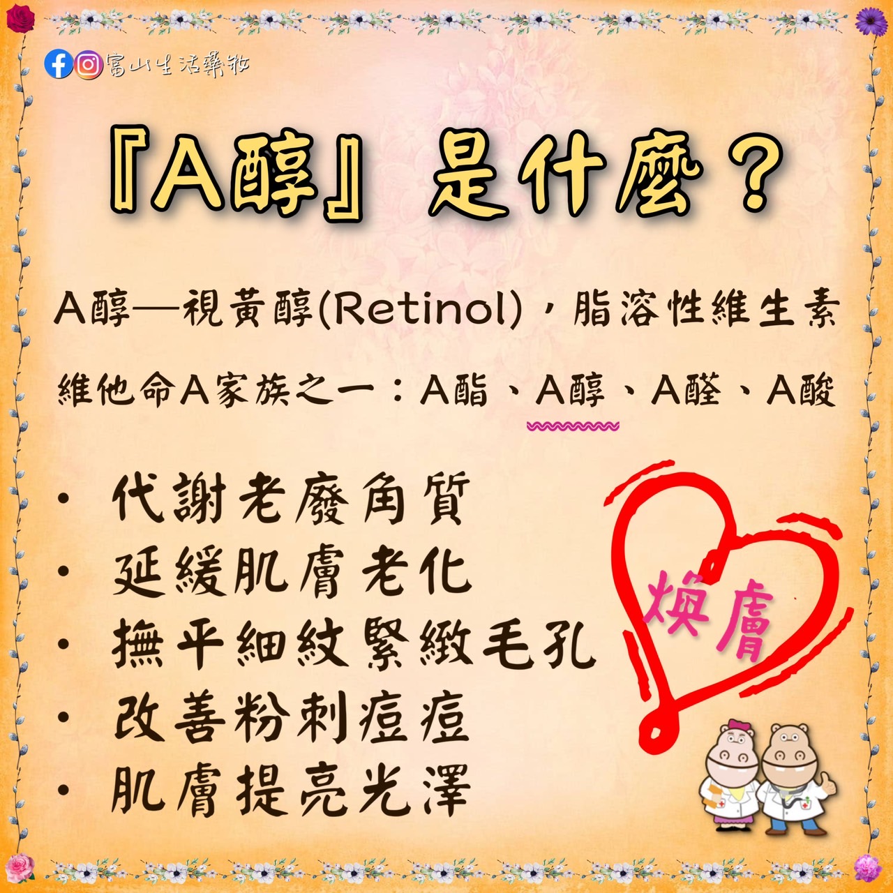 A醇(維他命A衍生物)又稱作「視黃醇(Retinol)」,是脂溶性維生素,也是維他命A家族的一員:A酯→A醇→A醛→A酸,而A醇最常被添加在保養品中,刺激性和穩定性都屬於中間值!可以讓我們的肌膚代謝老廢角質、延緩老化、撫平細紋、緊緻毛孔、改善粉刺痘痘、提亮光澤...等
