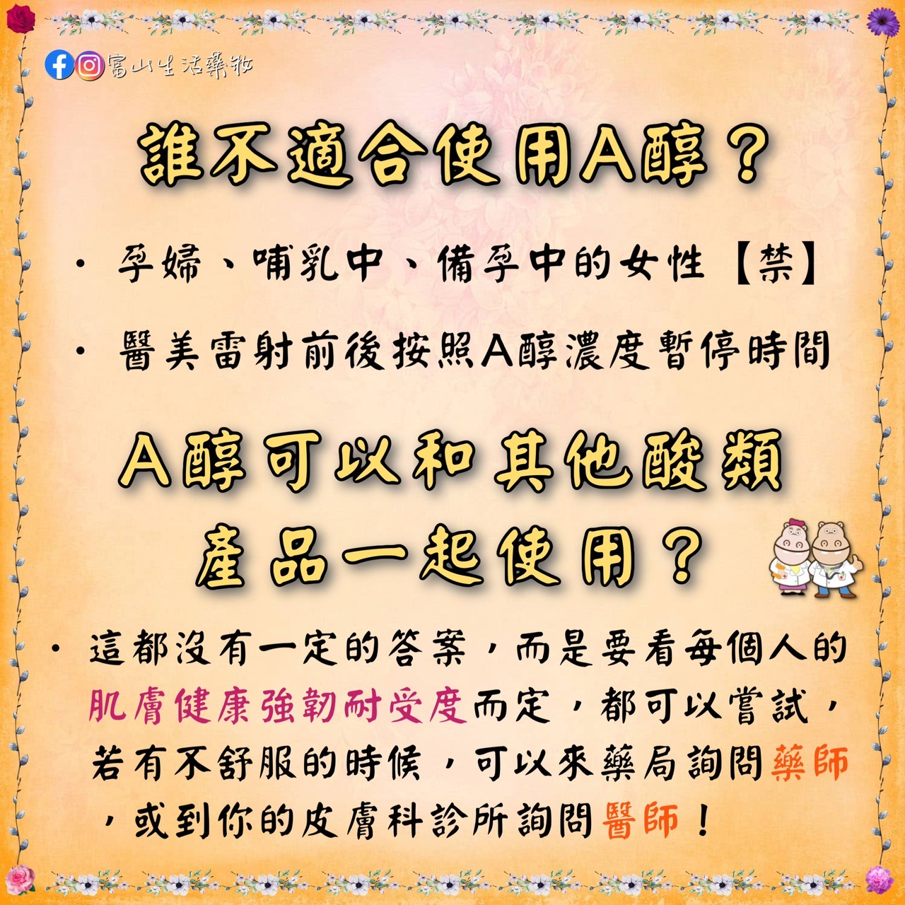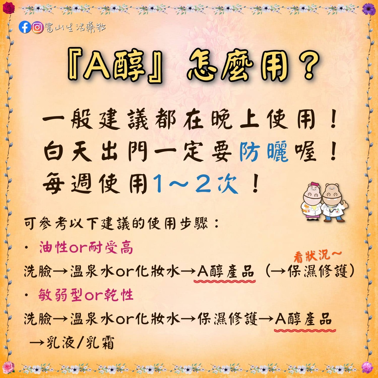 一般我們都建議在晚上使用,剛好屬於修護的時間;而白天出門前都會建議依定要加上防曬!A醇會按照肌膚狀況不同而有不同的使用次數,但保守建議都是每週使用1~2次。