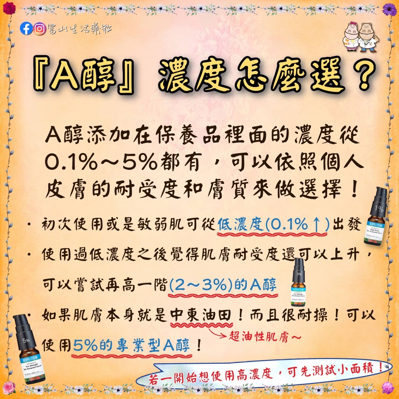 A醇被添加在保養品中的濃度從0.1%~5%都有,可以依照個人皮膚的耐受度和膚質作為選擇參考!建議新手玩家或是敏弱型肌膚可以從低濃度的開始,使用過後覺得肌膚耐受程度還可以再提升的話,則可以提高濃度到2~3%的A醇;如果本身就是中東油田(超油肌)、或是認為3%之後還可以再上升的肌膚,這裡有最高5%的專業型A醇可以讓你來挑戰唷!
