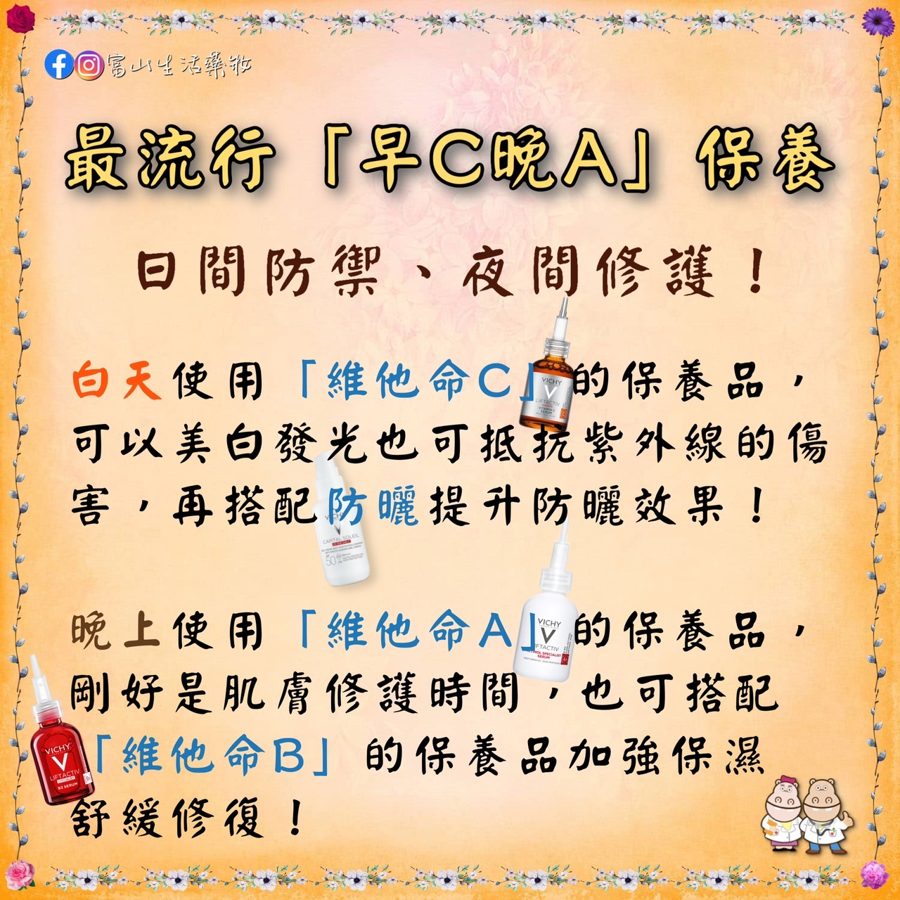 白天使用「維他命C」的保養品,除了可以美白發光,也可以抵抗紫外線的傷害,再搭配防曬提升防曬效果!晚上使用「維他命A」的保養品,趁著肌膚修護的時間,搭配「維他命B」的保養品加強保濕舒緩修復,下降泛紅脫屑的情況。達到日間防禦、夜間修護的雙重功效!