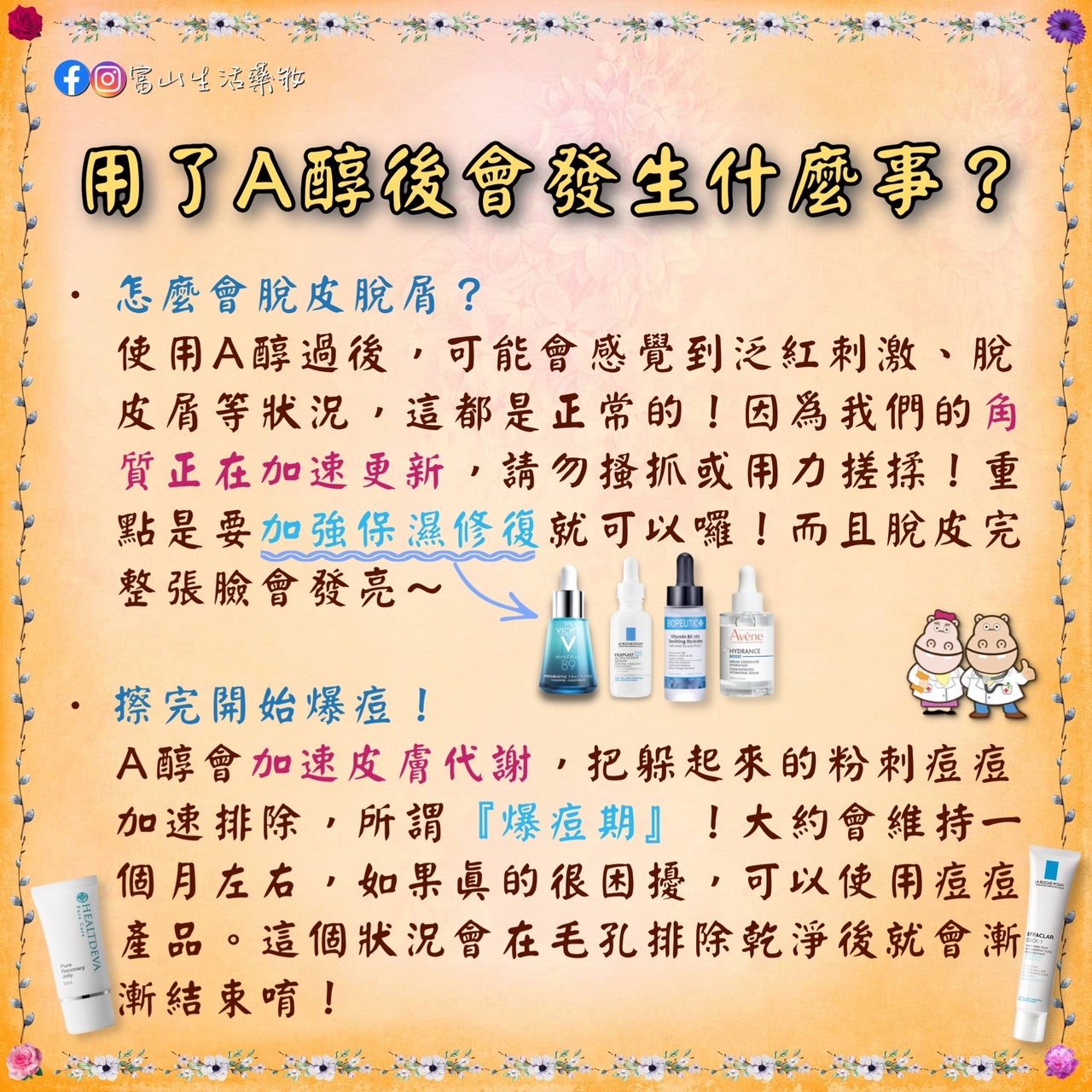 用了A醇產品約2~3天後會感覺的泛紅刺激、脫屑等狀況,這都是正常的喔!因為我們的角質正在加速更新,請不要用力搓揉或搔抓他們!重點就是要請著重在「加強修護保濕」就可以囉!而且脫皮完後整張臉會發亮~