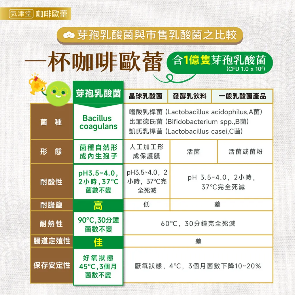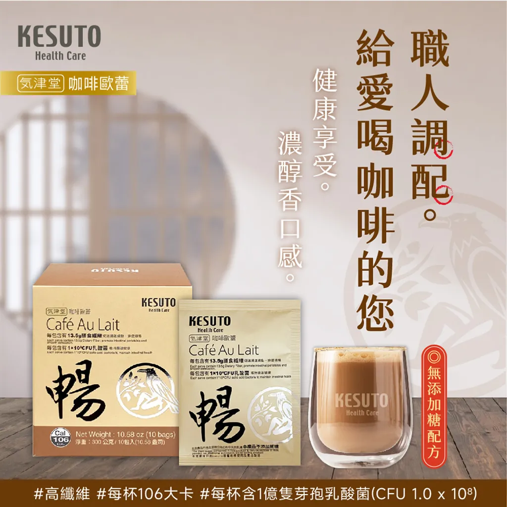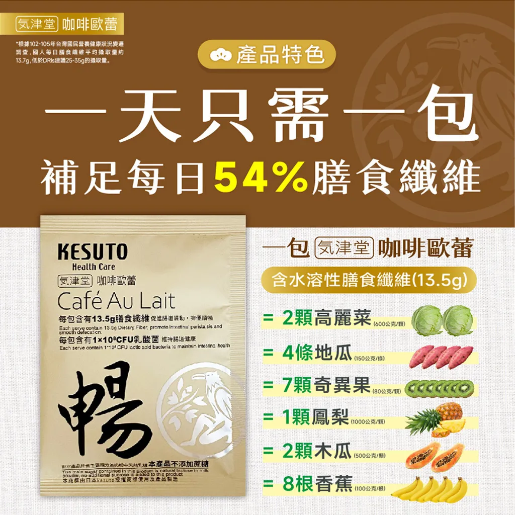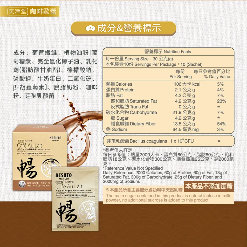主要成分:菊苣纖維、植物油粉[葡萄糖漿、完全氫化椰子油、乳化劑(脂肪酸甘油酯)、檸檬酸鈉、磷酸鉀、牛奶蛋白、二氧化矽、β-胡蘿蔔素]、脫脂奶粉、咖啡粉、芽孢乳酸菌