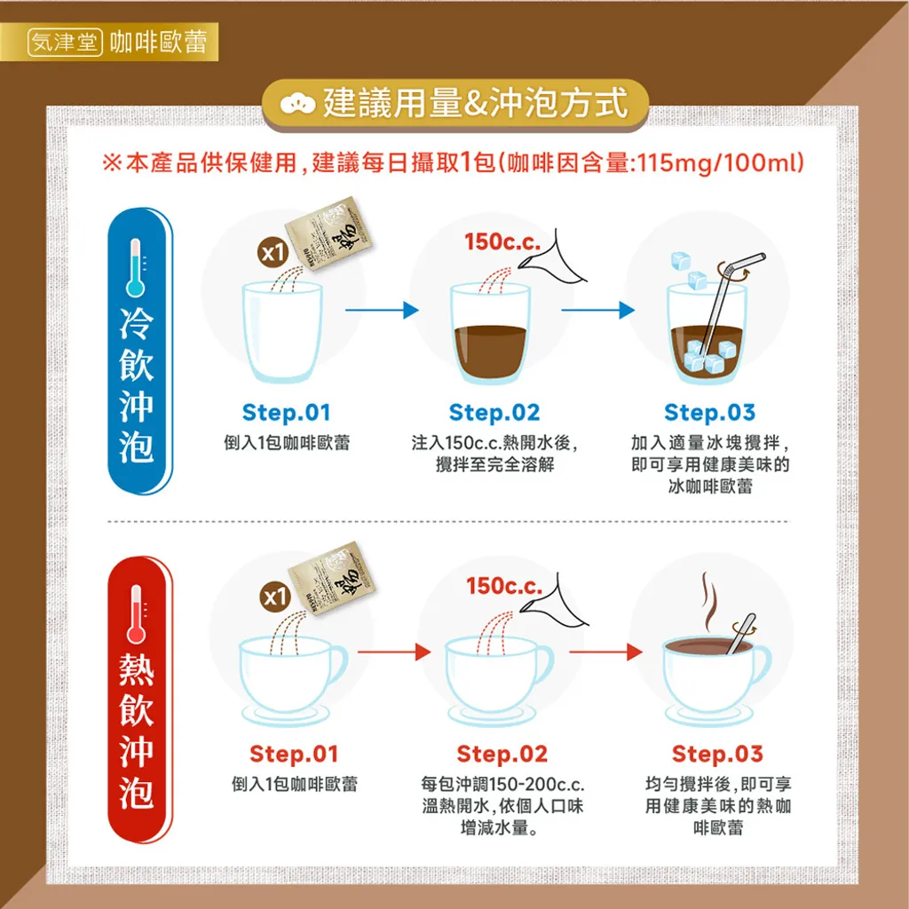 ●每一包沖調180~250 cc溫熱開水,依個人口味增減水量。