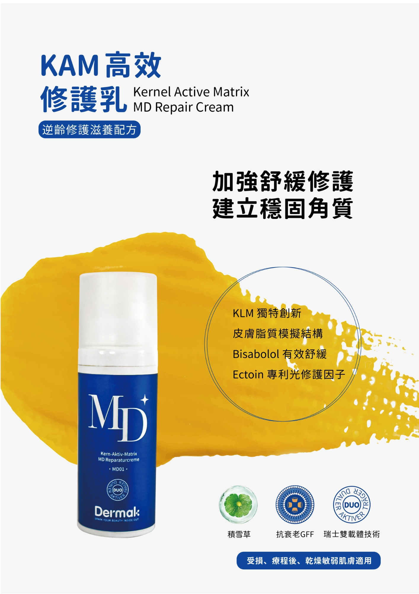 主要成分:創新皮膚脂質模擬結構KLM (Kernel Lipid Matrix)(角鯊烷、神經醯胺...)、積雪草(Centella Asiatica Leaf Vesicles)及半乳糖酵母發酵原液(Galactomyces Ferment Filtrate, GFF)之組合